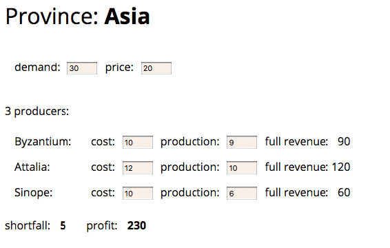 每个行省(province)都有一份生产计划,计划中包含需求量(demand)和采购价格(price)。每个行省都有一些生产商(producer),他们各自以不同的成本价(cost)供应一定数量的产品。界面上还会显示,当商家售出所有的商品时,他们可以获得的总收入(full revenue)。页面底部展示了该区域的产品缺额(需求量减去总产量)和总利润(profit)。用户可以在界面上修改需求量及采购价格,以及不同生产商的产量(production)和成本价,以观察缺额和总利润的变化。用户在界面上修改任何数值时,其他的数值都会同时得到更新。